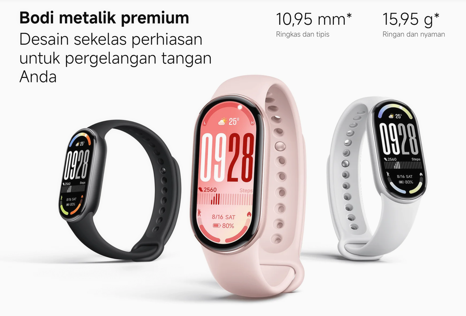 Xiaomi memperkenalkan empat varian untuk Smart Band 10. Tiga di antaranya memakai material aluminium alloy, sedangkan satu varian spesial bernama Pearl White menggunakan bahan keramik putih premium. Material metalik dengan finishing satin membuat tampilannya lebih modern dan berkelas dibanding pendahulunya, Smart Band 9.